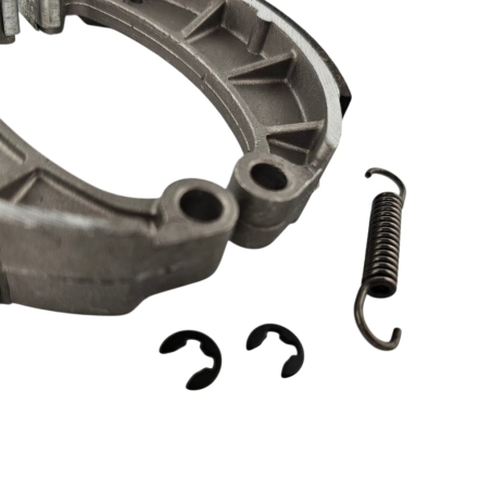 Zestaw dwóch szczęk hamulcowych, ze sprężynką i zabezpieczeniami falowymi, do motorowerów Simson S50, S51, SR50.