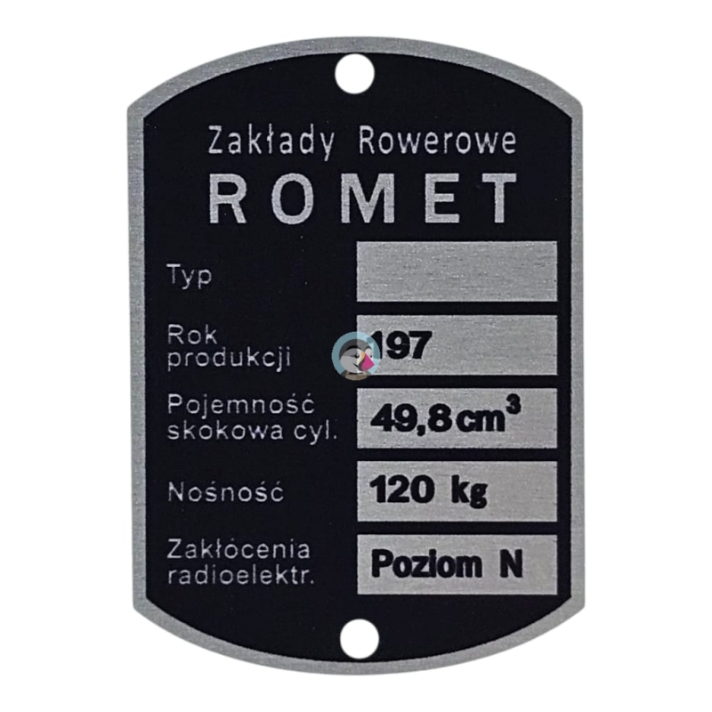 Tabliczka znamionowa " Zakłady rowerowe ROMET " do motorowerów Romet z lat 70-tych. Produkt wysokiej jakości, kolekcjonerski. Produkowany według oryginalnego wzoru i ze wszystkimi oryginalnymi znakami.