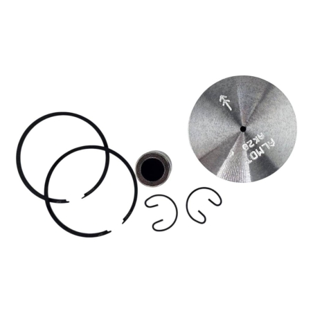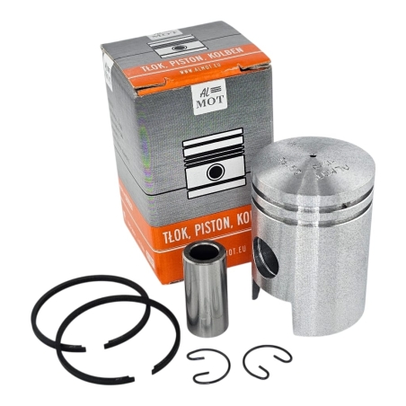 Kompletny, najwyższej jakosci tłok na 1 szlif ( 38,25mm ) polskiej firmy Almot ze stopu AK20 na dwa pierścienie. Zestaw zawiera tłok AK20, pierścienie, sworzeń i zabezpieczenia sworznia tłoka.
