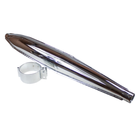 Tłumik chromowany z obejmą, również chromowaną, do motorowerów Simson S51. Pasuje również do motorowerów Simson SR50, ale wymaga dodatkowo zakupu obejm tłumika - pierwszej, łączącej dwie połówki, i drugiej, mocującej do ramy.