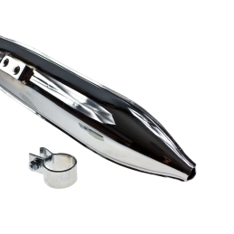 Tłumik chromowany z obejmą, również chromowaną, do motorowerów Simson S51. Pasuje również do motorowerów Simson SR50, ale wymaga dodatkowo zakupu obejm tłumika - pierwszej, łączącej dwie połówki, i drugiej, mocującej do ramy.