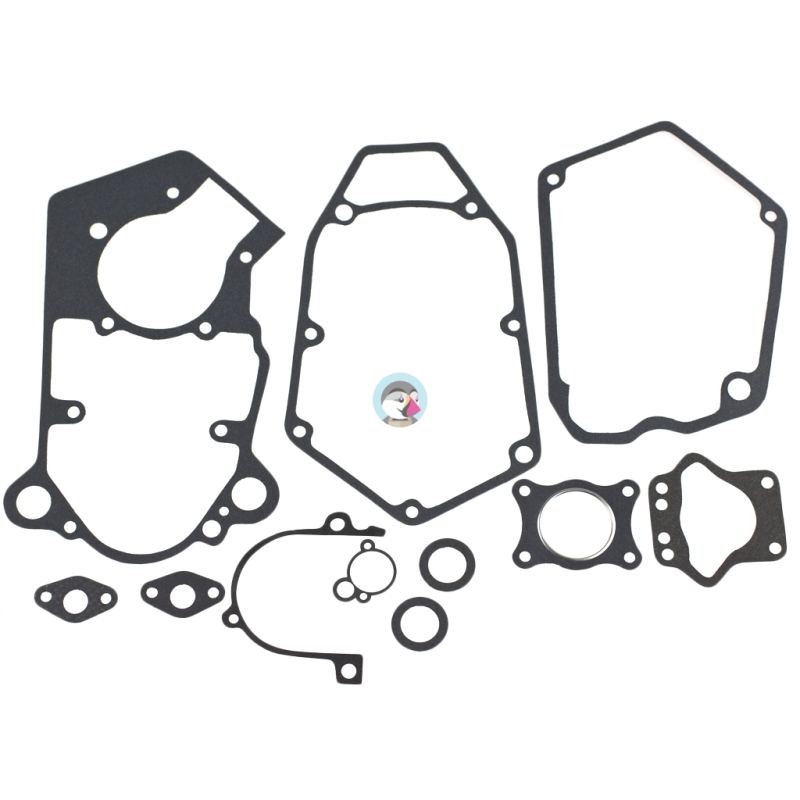 zestaw zawiera uszczelki na cały silnik: pod pokrywę sprzęgła, pomiędzy kartery, pod pokrywę iskrownika, pod pokrywę automatu zmiany biegów, pod głowicę, pod cylinder, pod króciec ssący, pod kolanko wydechowe, pod pokrywkę komory pływakowej