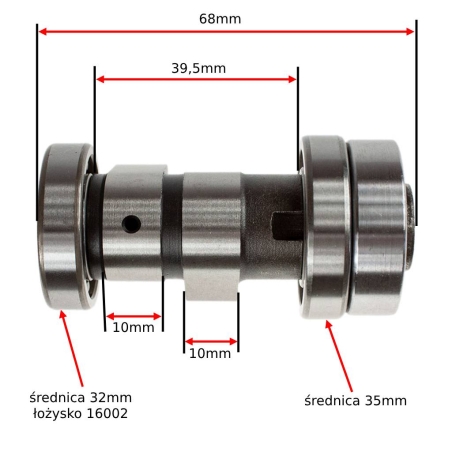Wałek rozrządu z zębatką łańcuszka rozrządu i łożyskami, do skuterów z silnikami czterosuwowymi 4T 139QMB. Wałek rozrządu tuningowy, nadaje się do montażu w skuterach z cylindrami 50cm3, 60cm3, 80cm3.Wysokiej jakości produkt.