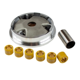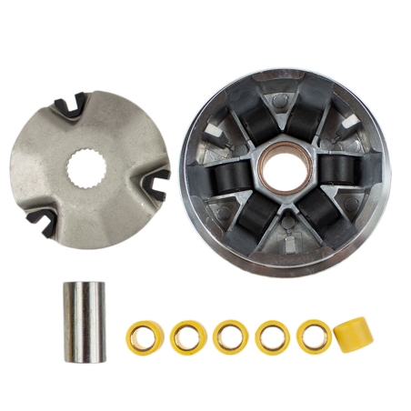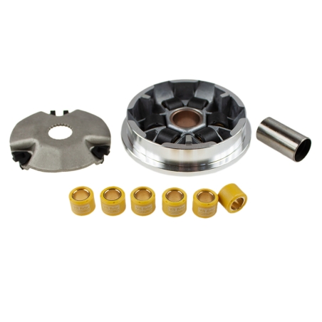Wariator kompletny, tuningowy, do skuterów czterosuwowych z silnikami GY6 125cm 150cm, montowanych w maxiskuterach produkcji chińskiej.W skład zestawu wchodzą: wariator tuningowy, rolki wariatora, talerz wariatora i tuleja wariatora.