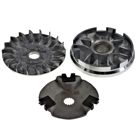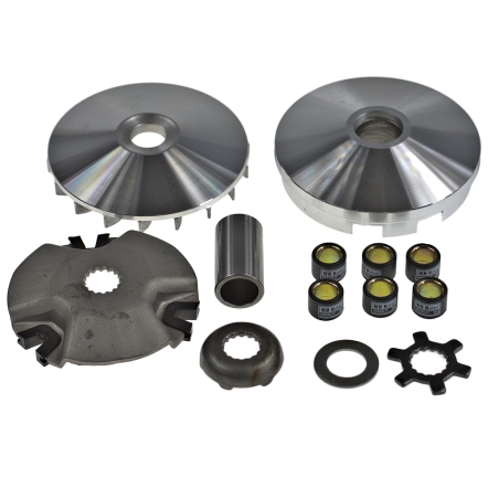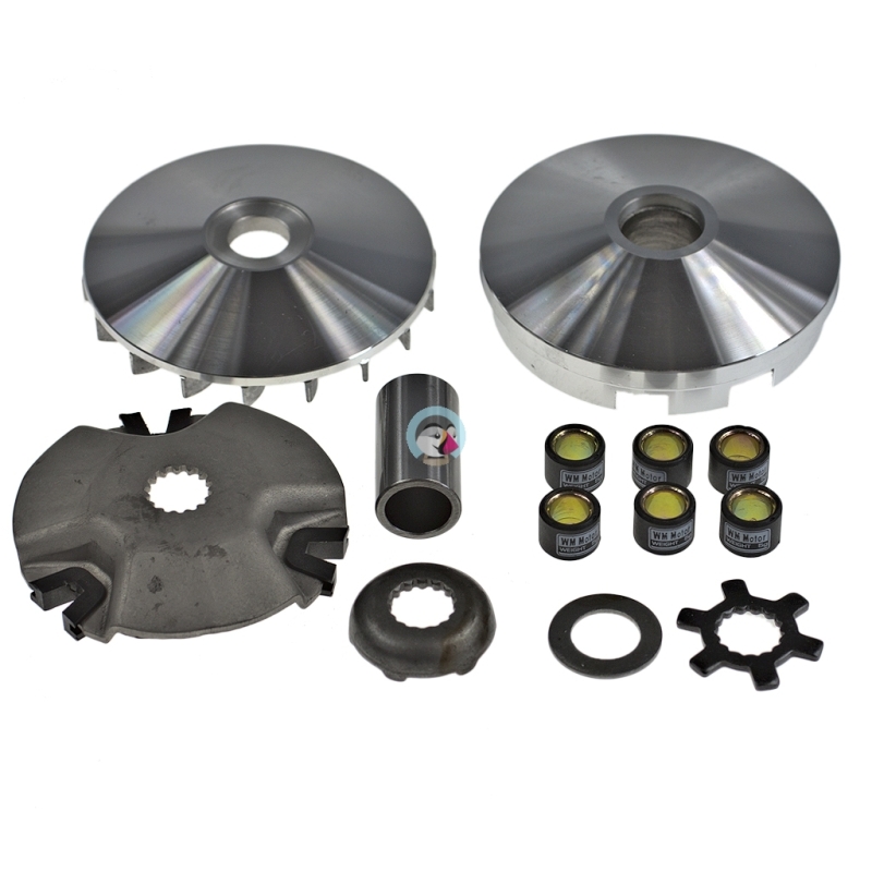 Wariator tuningowy, do skuterów Honda, Peugeot.W skład zestawu wchodzą tuningowy wariator z większą średnicą ilepszym chłodzeniem, zestaw rolek wariatora, talerz wariatora i tuleja wariatora.