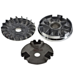 Wariator tuningowy, do skuterów 2T z wieloklinem wału 16mm.W skład zestawu wchodzą: wariator tuningowy o lepszym chłodzeniu i większej średnicy, dwa zestawy rolek, dwie tuleje, przeciwtalerz wariatora tuningowy.