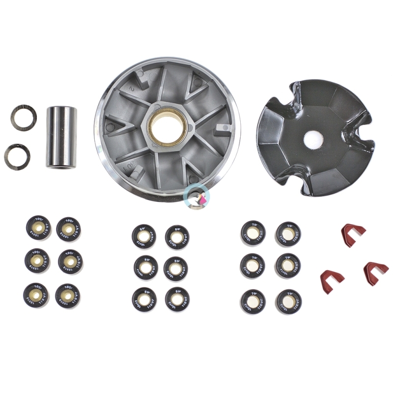 Wariator tuningowy, do skuterów Honda, Peugeot.W skład zestawu wchodzą tuningowy wariator z większą średnicą ilepszym chłodzeniem, zestaw rolek wariatora, talerz wariatora i tuleja wariatora.