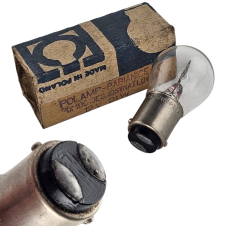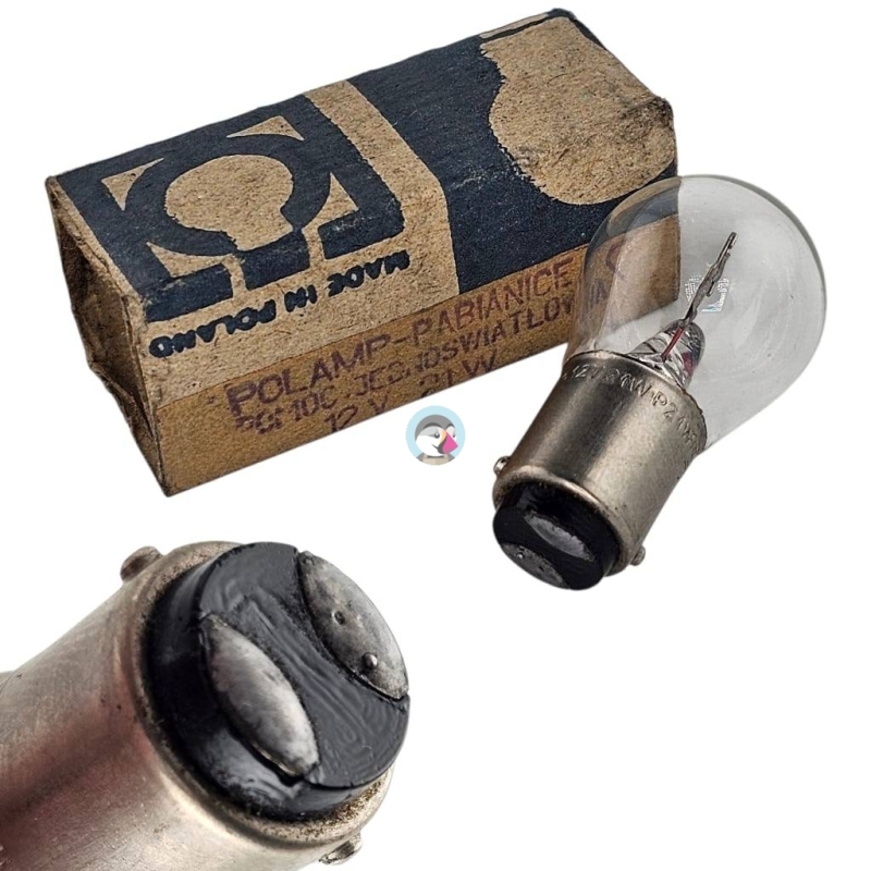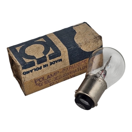 Żarówka POLAMP 12V 21W BA15s - Dwie nóżki do podpięcia. Homologacja E8 - Produkt oryginalny z epoki.