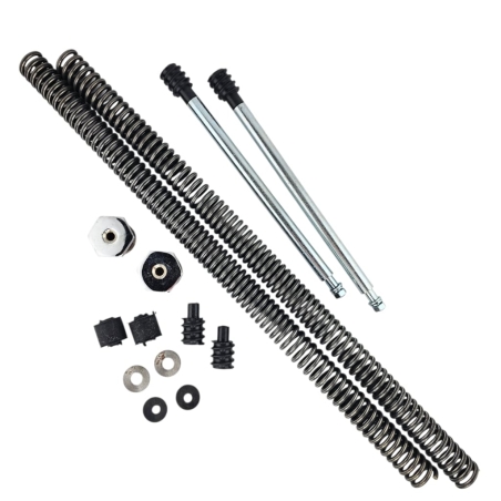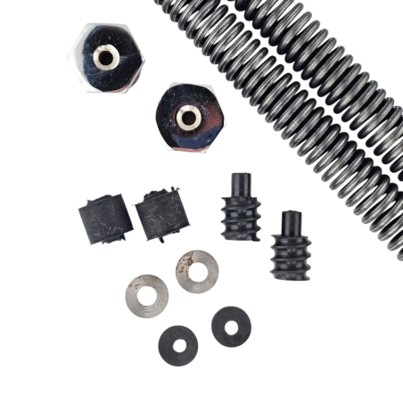 Kompletny zestaw regeneracyjny na dwa teleskopy przednie z olejem Amortyzol, do motocykli WSK125 WSK175. W skład zestawu wchodzą: dwie sprężyny, olej, 4 uszczelniacze, 4 tuleje ślizgowe i prowadzące.