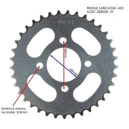 Zębatka napędowa, tylna, do motorowerów Zipp, Nekken, Shaft, Street.Wymiary: średnica wewnętrzna: 58mm ; rozstaw śrub: 78mm ; średnica otworu na śrubę: 8,5mm ; ilość śrub montażowych: 4 ; moduł łańcucha 428 ; ilosć zębów: 47