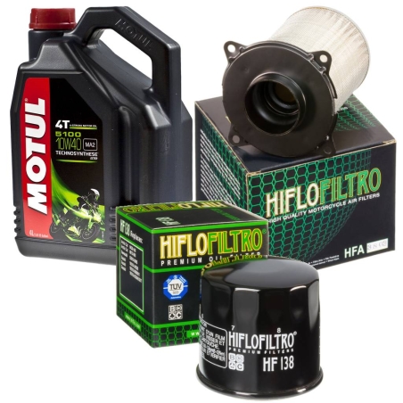 Zestaw serwisowy, an tkóry składa się olej Motul 5100 10W40 4 litry, filtr oleju Hiflofiltro HF138, oraz filtr powietrza Hiflofiltro, do motocykli Suzuki VZ800 Marauder.