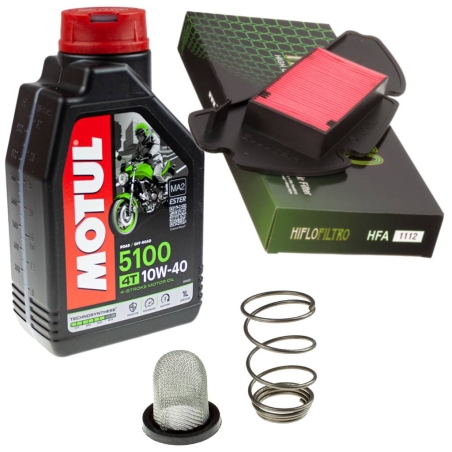 Zestaw zawierający filtr oleju, filtr powietrza, i olej Motul Scooter Power MB 10W-30 do motocykli Honda PES125 JF17 06-13, PES150 KF09 06-10. Wysoka jakość produktów zapewnia świetne właściwości dla silnika i bezpieczną eksploatację.