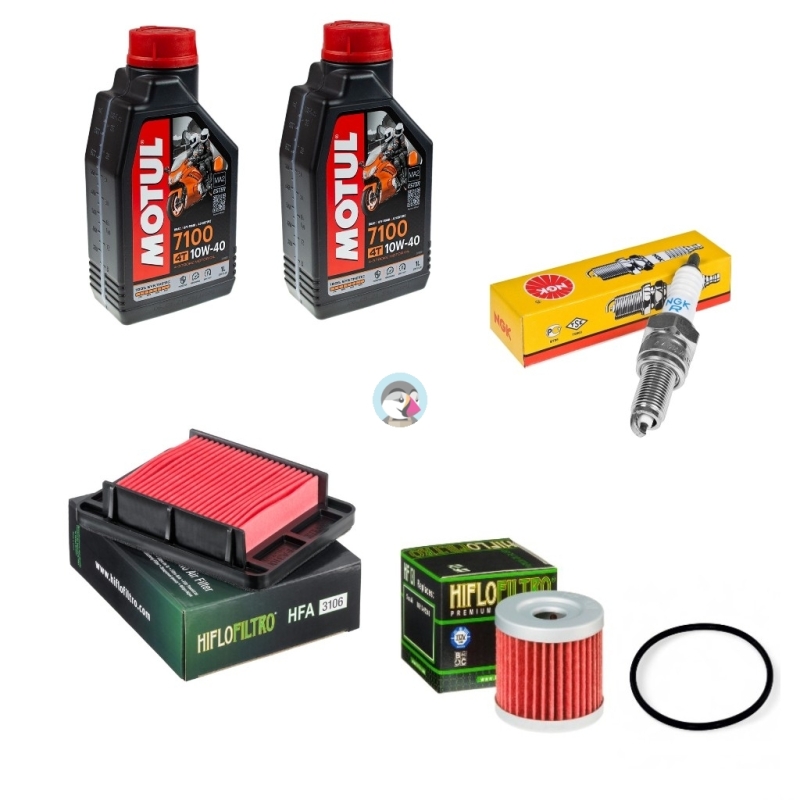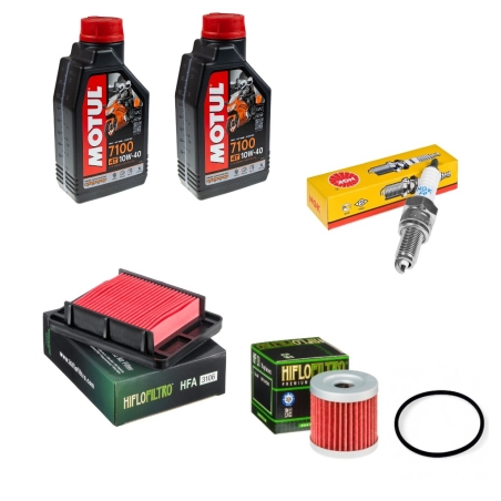 Zestaw serwisowy, na który składa się olej Motul 7100 10W40 1 litr, syntetyczny, filtr oleju Hiflofiltro, filtr powietrza WM, świeca zapłonowa NGK, do motocykli Honda CBF125 2009 - 2016.
