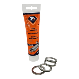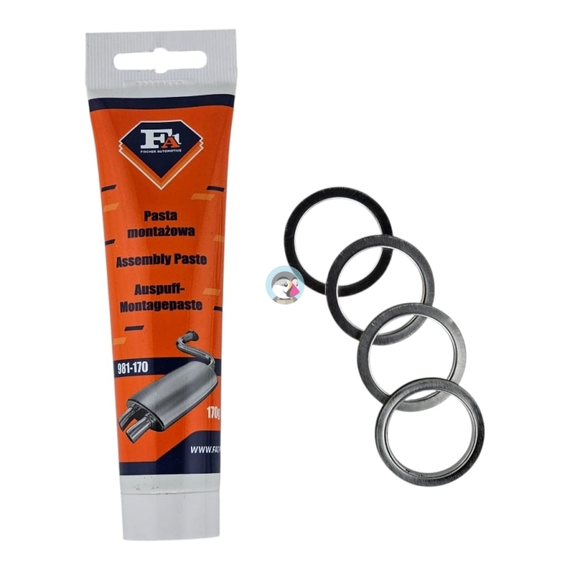 Zestaw 4 sztuk uszczelek kolektora wydechowego, włoskiego producenta Athena, wraz z pastą montażową Fischer, dedykowaną pod kolektory i tłumiki, odporne na wysoką temperaturę.